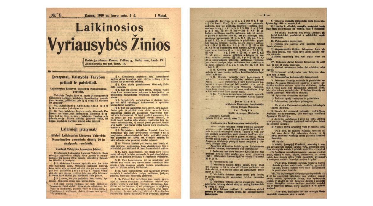 nepriklausomos Lietuvos įstatyminis aktas, 1919–1940 reguliavęs karo padėties režimą, 1919 02 05 priimti Ministrų Kabineto, 1919 03 05 – Valstybės Tarybos.